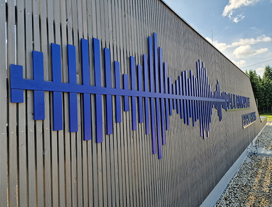 Proberaum der Bauernkapelle EberschwangDas besondere gestalterische Element an der Außenseite ist, dass der Namenszug der Bauernkapelle Eberschwang von einer stilisierten Klangfrequenz begleitet wird. Und somit ein Miteinander darstellt. Die großflächige Bewegung der Klangfrequenz ist eine visuelle Interpretation eines musikalischen Tons, wie er im Proberaum tagtäglich entsteht. Diese Klangfrequenz macht bereits von außen sichtbar, was im Inneren gelebt wird: Musik in ihrer ganzen Vielfalt. Ein Ort, an dem Musik Raum bekommt. Architektin Sarah Grusch Ried i.I. ©2025 Marion Kilianowitsch / Walter Kainz |